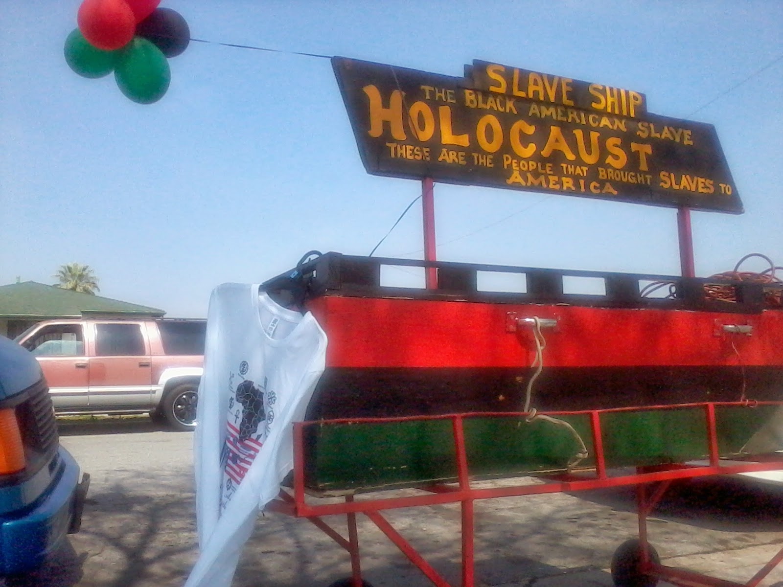 There is a small crowd of about 30 or so people scattered in booths. What are they selling? Shirts, food, but mostly to promote National Reparations Day (NRD).